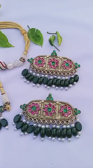 This elegant 3 Phool set includes a choker, matching studs, and an adjustable ring, offering a coordinated look for any occasion. The ring’s adjustable size ensures a comfortable fit, while the choker and studs add a refined touch to your ensemble. Perfect for enhancing traditional or contemporary outfits with subtle sophistication.