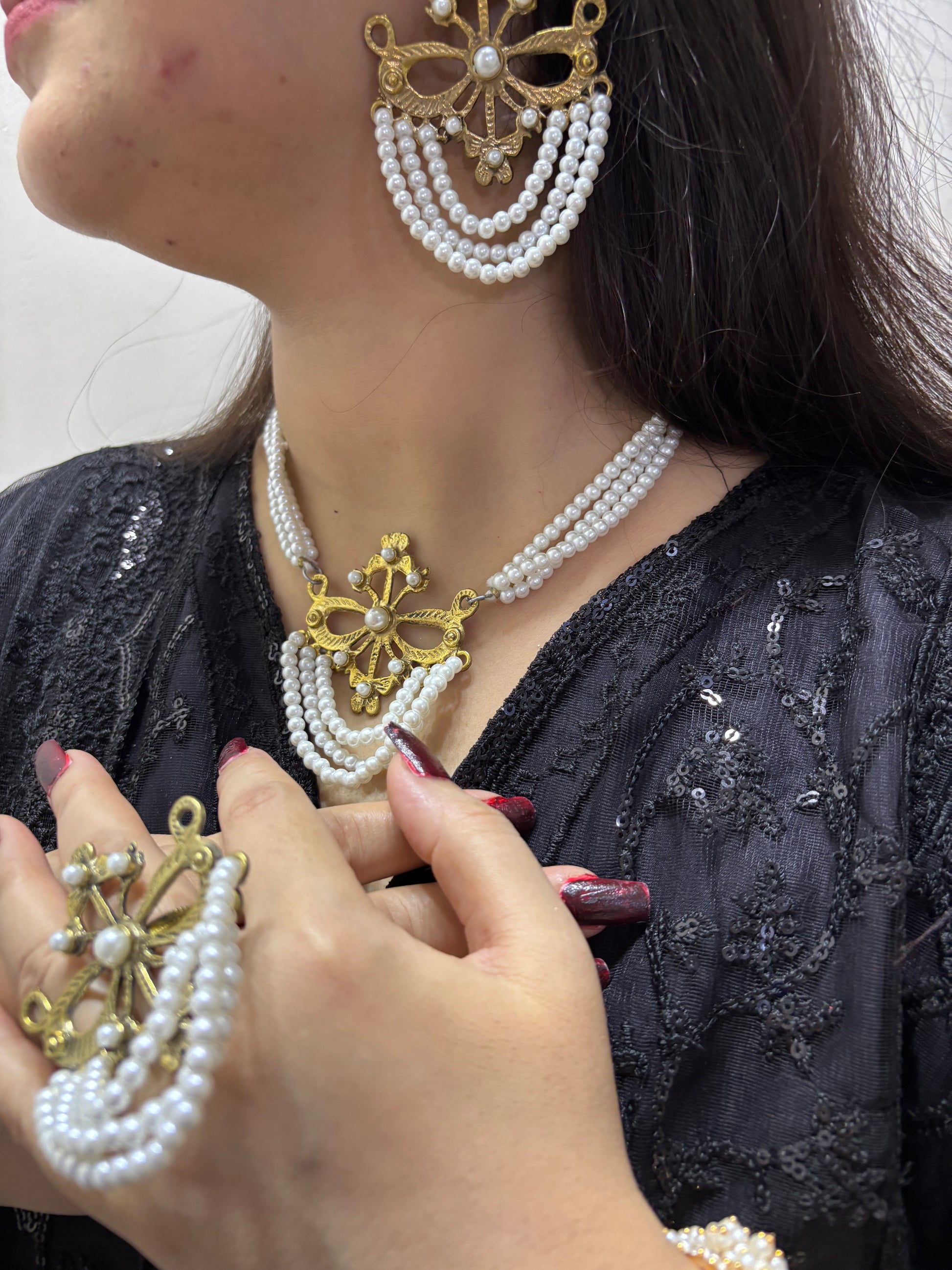 This elegant jewelry set features a delicate bow-inspired choker paired with matching stud earrings, designed to add a refined touch to any outfit. The accompanying ring is adjustable, ensuring a comfortable and perfect fit for various finger sizes. Crafted with attention to detail, this set combines style and versatility, making it an ideal choice for both everyday wear and special occasions.
