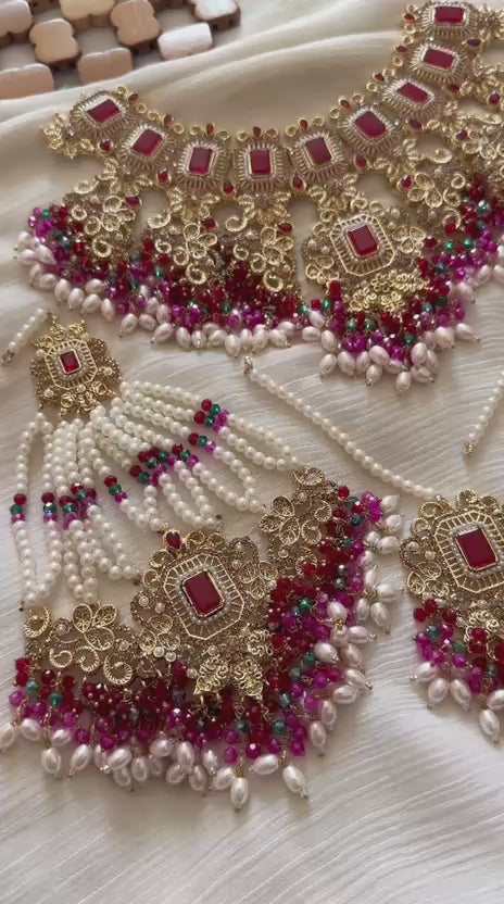 The Dhanak Bridal Set is meticulously crafted to enhance bridal elegance with its exquisite design and fine craftsmanship. This set combines traditional artistry with sophisticated detailing, perfect for making a memorable statement on your special day. Each piece is designed to complement bridal attire beautifully, ensuring a harmonious and regal look that stands out effortlessly. Ideal for brides seeking timeless refinement and cultural richness in their wedding ensemble.