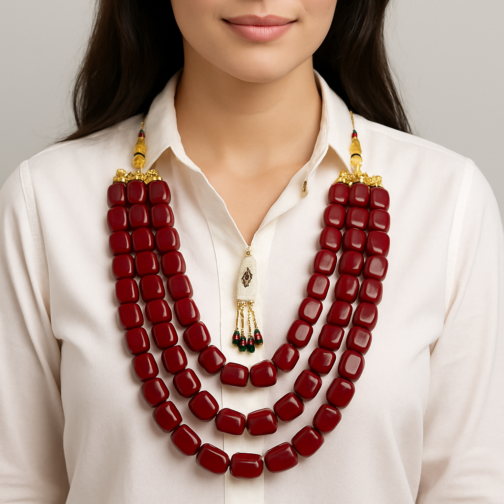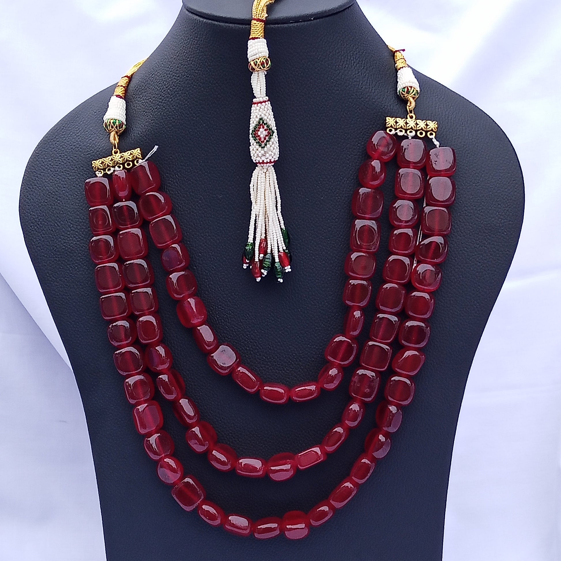 Gull e Alaq Mala showcases exquisite craftsmanship using semi-precious stones paired with high-quality fancy Indian Dori. This elegant accessory combines traditional artistry with durable materials, offering both beauty and lasting wear. Ideal for enhancing formal and festive attire, it reflects expert design and attention to detail.