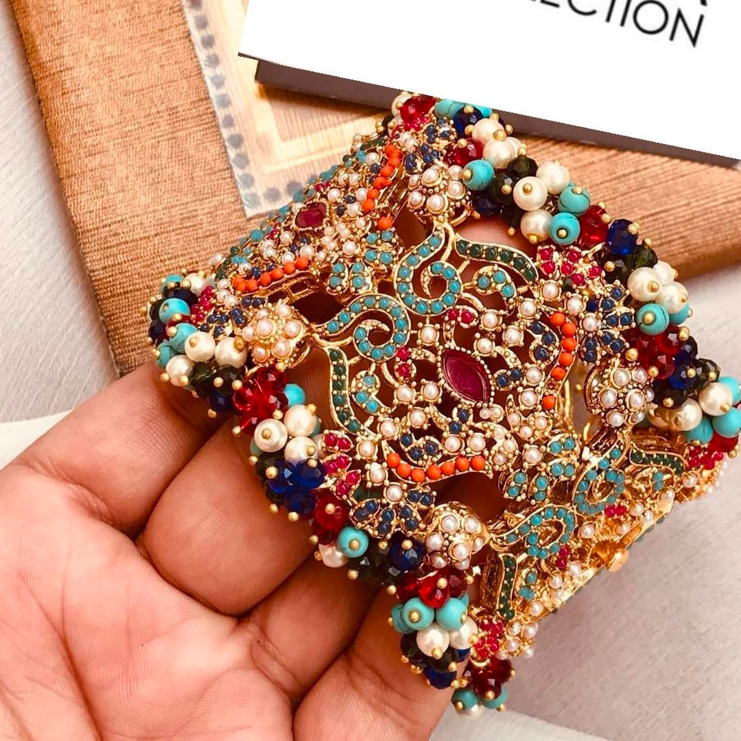Jadau Kangun - Adjustable Size Elevate your traditional wardrobe with this exquisite Jadau Kangun, a timeless piece of Pakistani jewelry craftsmanship. Featuring intricate Jadau work—the ancient art of setting precious stones in gold foil—this kangun showcases meticulous artisanal detail. The adjustable sizing ensures a comfortable, personalized fit for any wrist, making it versatile for daily wear or special occasions. Perfect for those who appreciate authentic, handcrafted jewelry that blends heritage with contemporary style. A statement piece that reflects sophistication and cultural elegance.