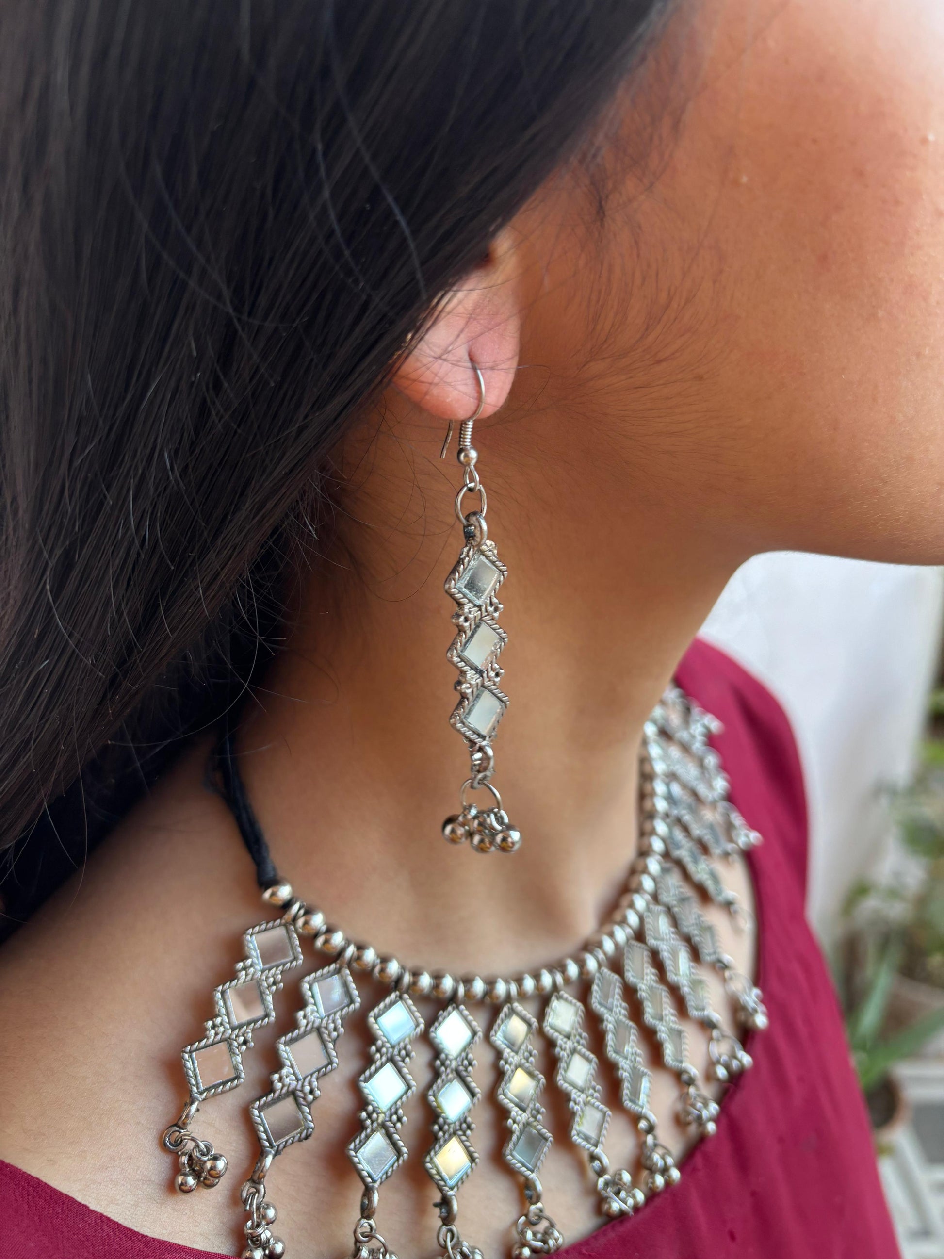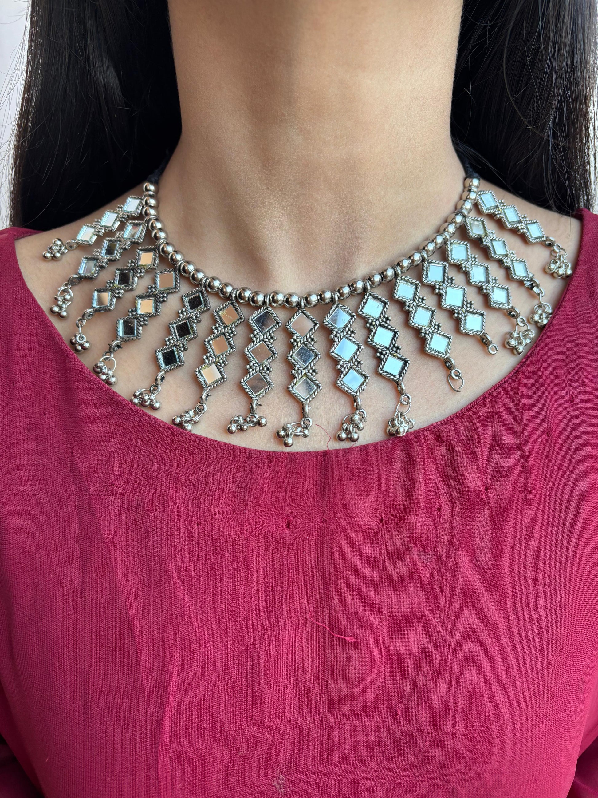 This exquisite mirror choker set combines traditional craftsmanship with contemporary elegance. Featuring intricately designed mirror work, it adds a radiant sparkle to any outfit. Perfect for special occasions, this set enhances your neckline with a sophisticated charm, making it an essential accessory for those who appreciate detailed artistry and refined style.