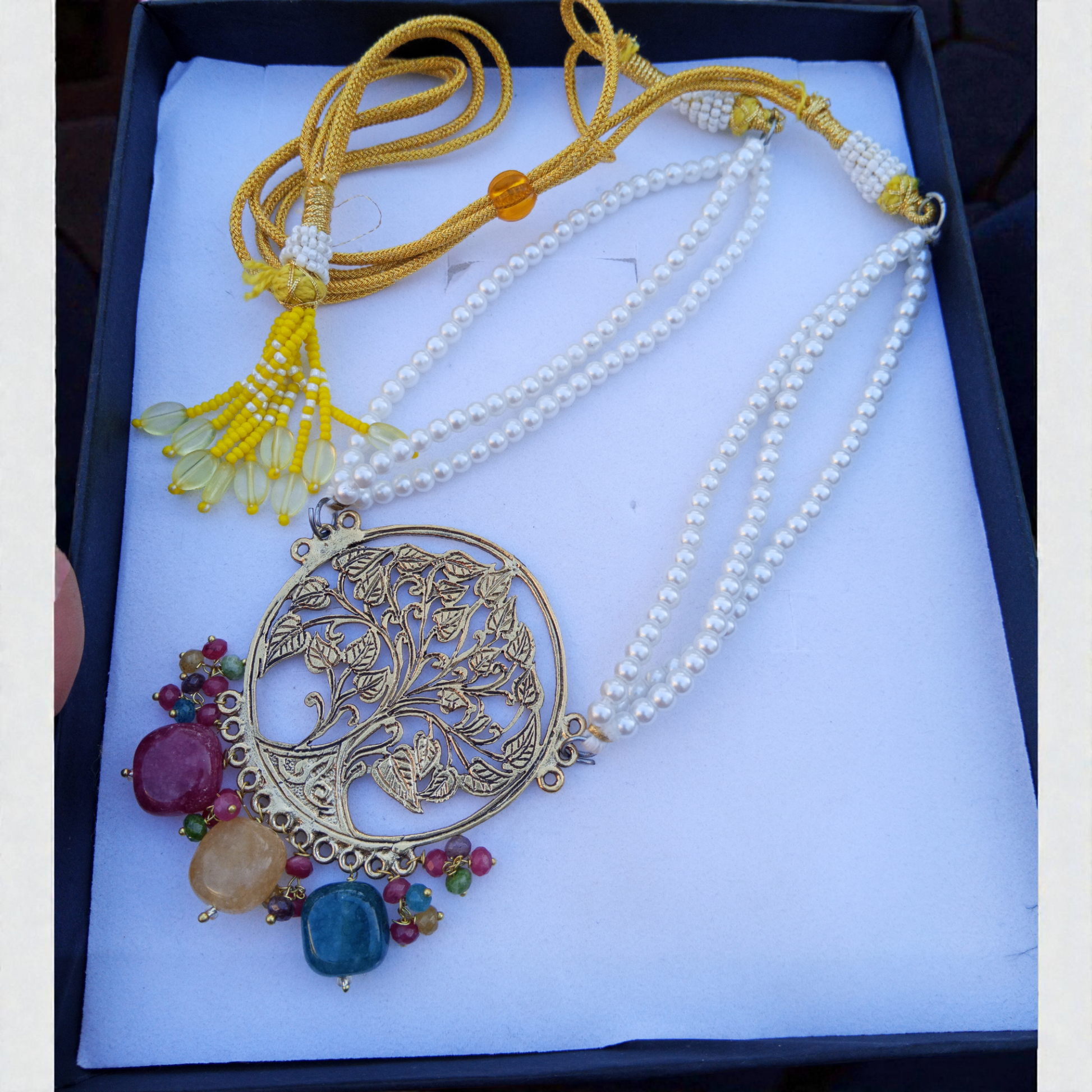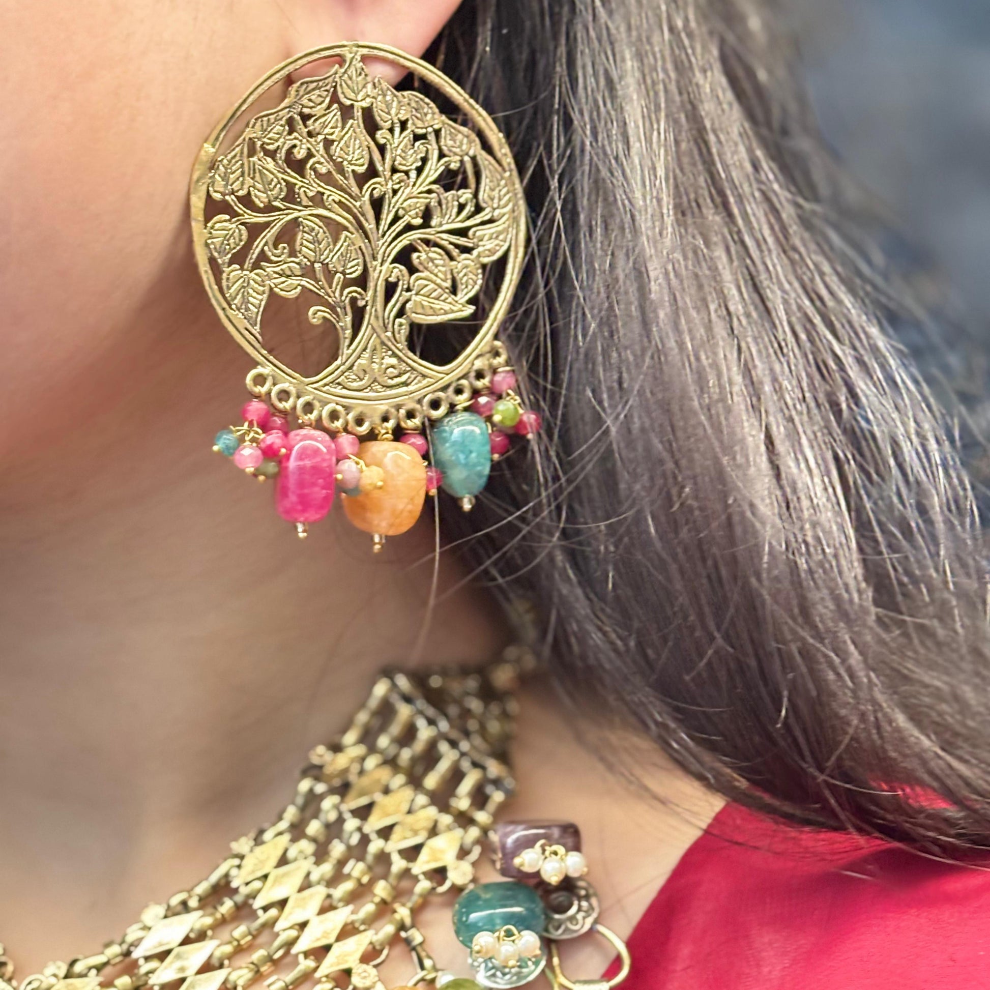 Elevate your jewelry collection with this exquisite Multi Glow Tree Set, expertly crafted to showcase the natural radiance of semi-precious stones. This sophisticated ensemble features a stunning chokar necklace paired with matching studs, each piece adorned with carefully selected gemstones that catch and reflect light beautifully. The tree-inspired design adds an organic elegance to your look, making it perfect for both special occasions and refined everyday wear. The semi-precious stones offer durability and timeless appeal, while the coordinated set ensures effortless styling. A versatile investment piece that combines artisanal craftsmanship with contemporary design sensibilities.