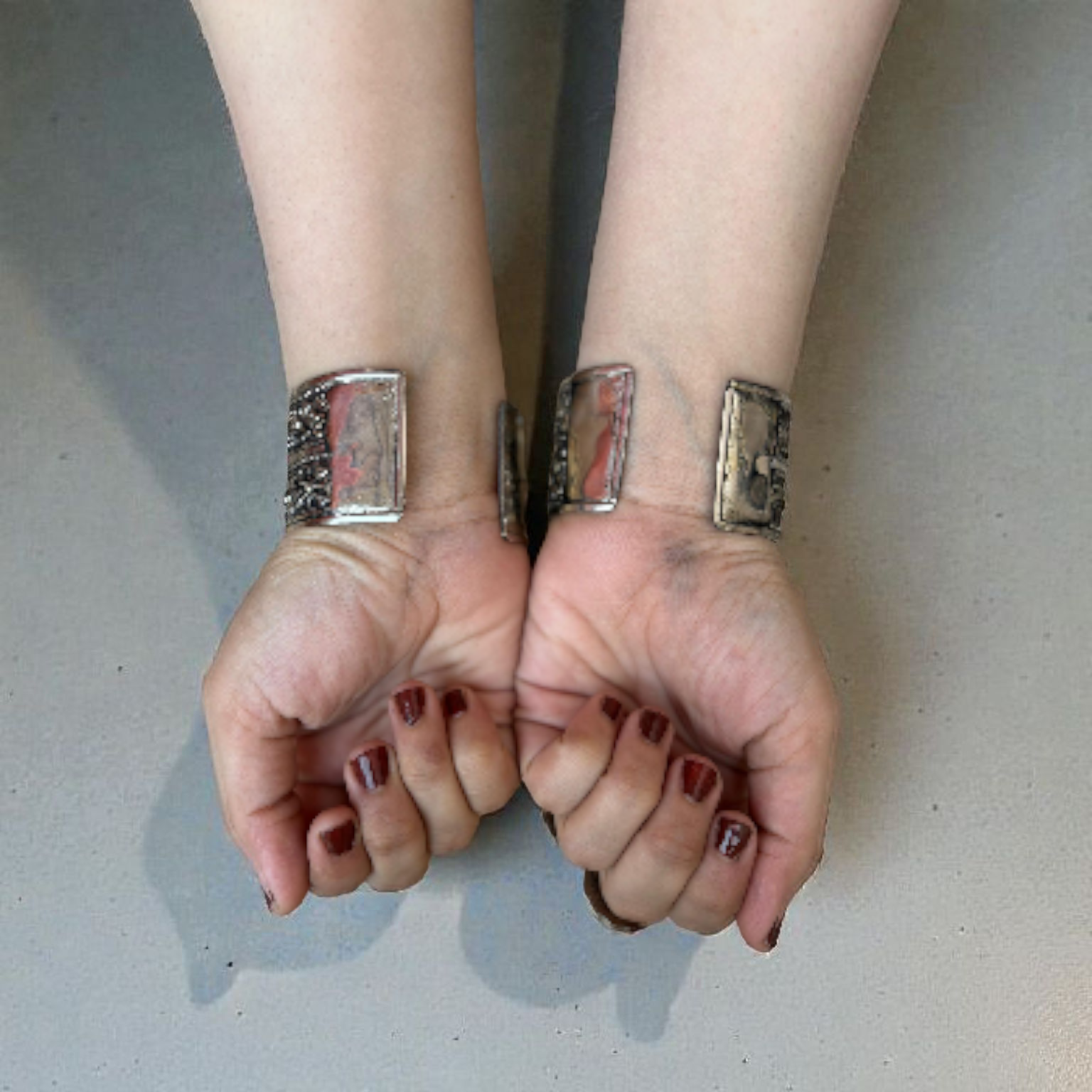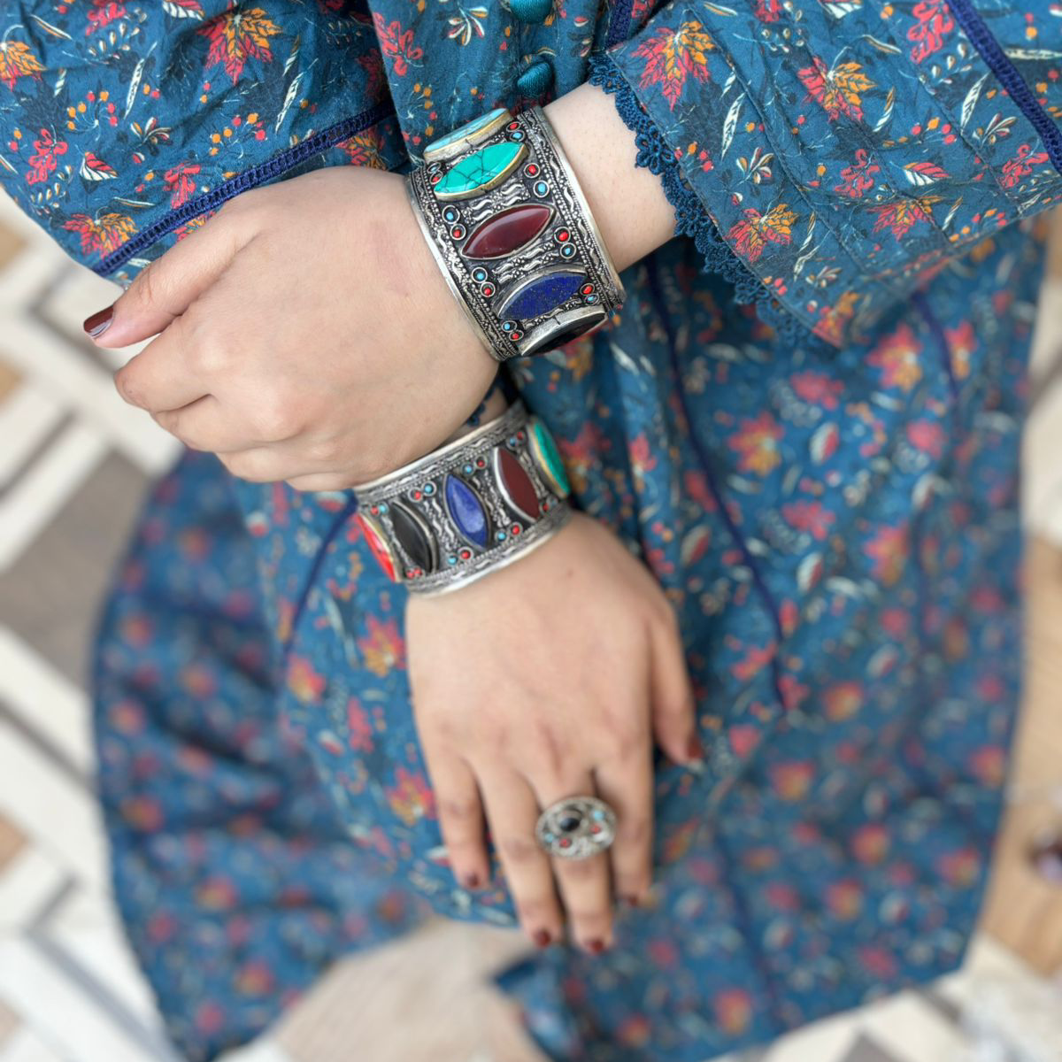 Elevate your wrist game with this exquisite multi-stone German Polish hand cuff pair. Meticulously crafted using traditional German polishing techniques, each cuff showcases an array of carefully selected stones that catch light beautifully. The expert stonework demonstrates superior craftsmanship, while the polished finish ensures a refined, sophisticated appearance. Perfect for those who appreciate fine jewelry with authentic European artistry. These hand cuffs make a bold statement piece that transitions seamlessly from formal occasions to elevated everyday wear. A testament to quality and timeless elegance.