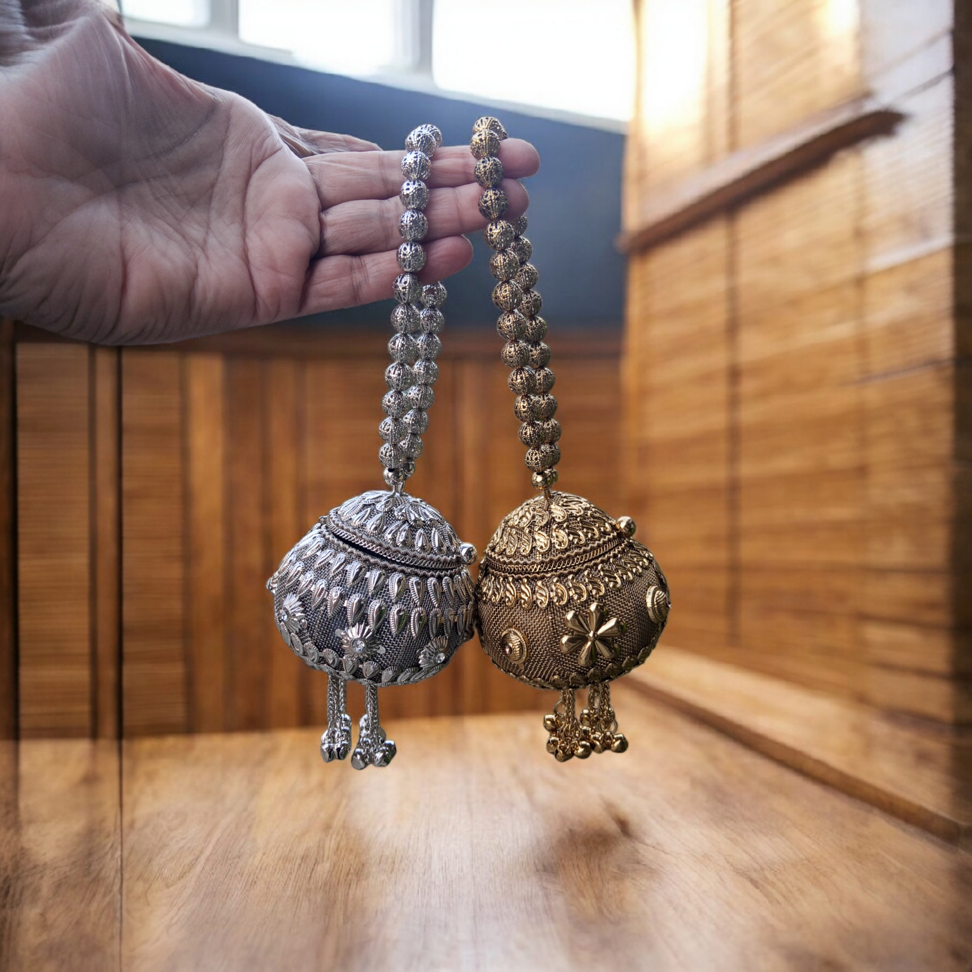 Elevate your evening ensemble with this exquisite Potli clutch, a timeless accessory that seamlessly blends traditional craftsmanship with contemporary elegance. Available in lustrous silver and radiant golden finishes, this compact clutch features the iconic potli design—a signature element of South Asian fashion. The small size makes it perfectly suited for intimate gatherings, weddings, and special occasions, offering just enough space for your essentials while maintaining a refined silhouette. Crafted with meticulous attention to detail, this versatile piece complements both traditional and modern attire, making it an indispensable addition to any discerning wardrobe.