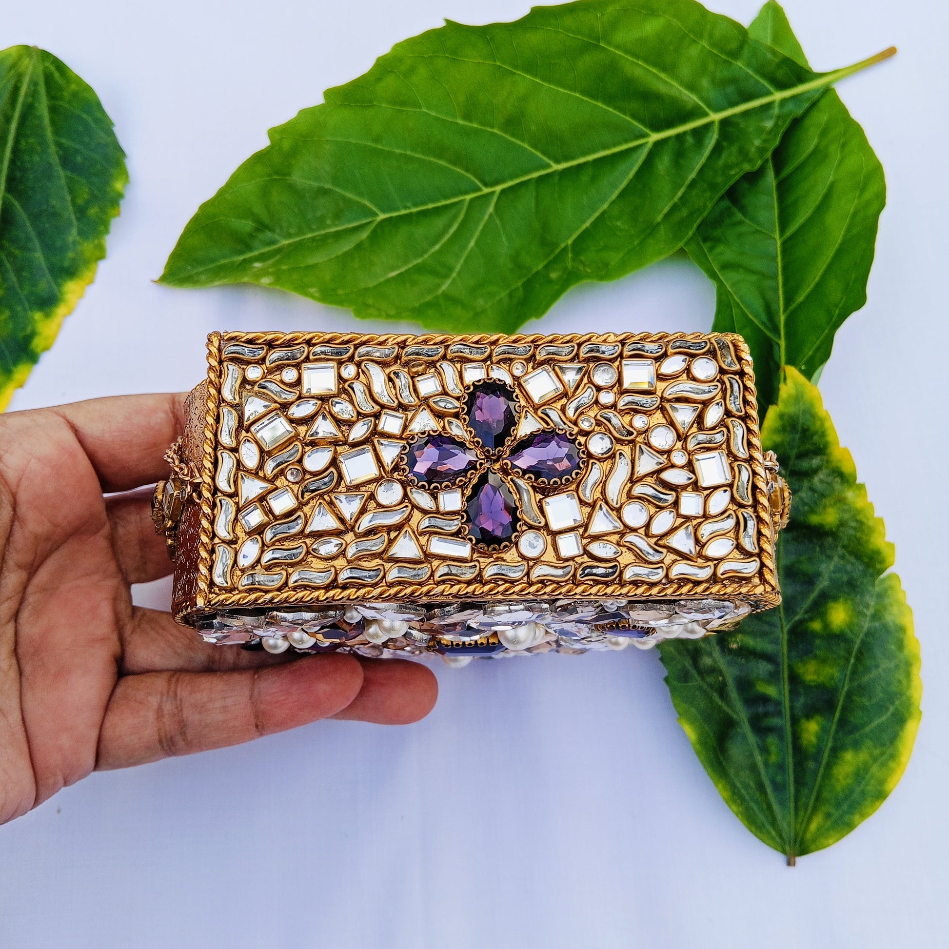 Elevate your evening ensemble with this striking Purple Rain Kundun Clutch, a sophisticated accessory that seamlessly blends traditional craftsmanship with contemporary style. Featuring intricate kundun work—a delicate embellishment technique that adds dimensional sparkle and texture—this clutch commands attention with its rich purple hue. The compact silhouette fits essentials while maintaining an elegant profile, making it ideal for formal occasions, weddings, and upscale events. Expertly crafted with attention to detail, this piece serves as both a functional accessory and a statement of refined taste, perfect for those who appreciate artisanal quality and timeless design.