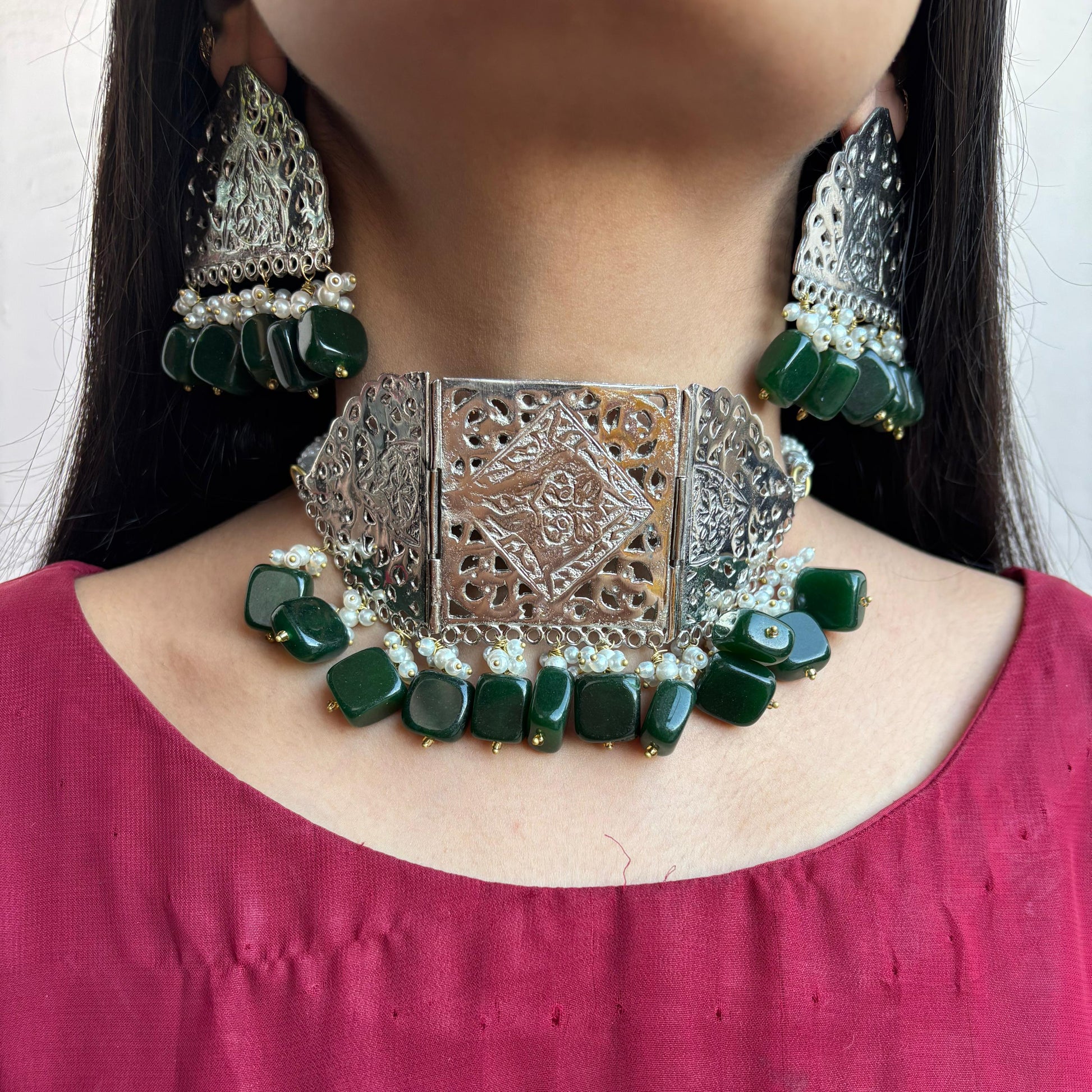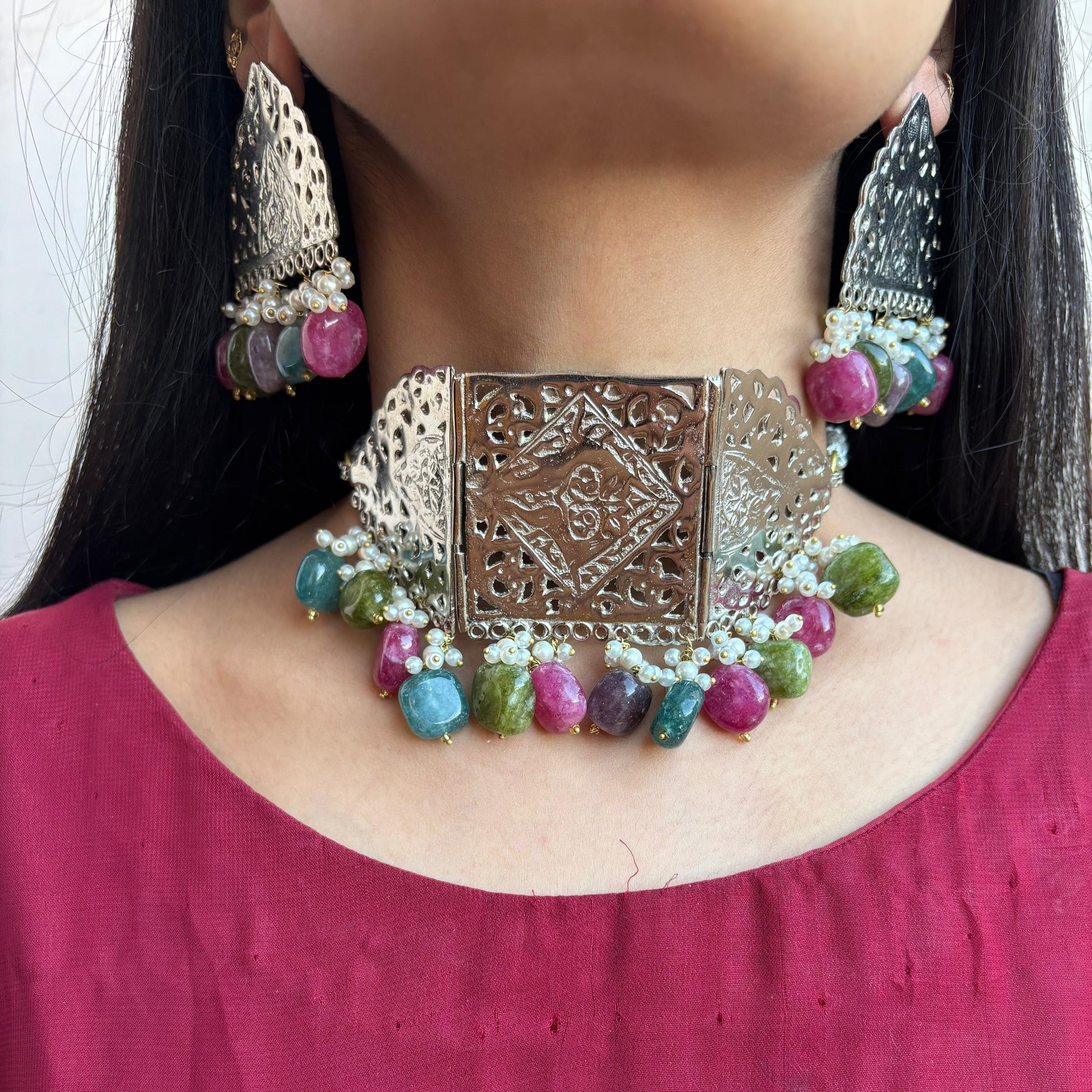 Elevate your jewelry collection with our exquisite semi-precious stone silver choker and studs. Crafted with authentic sterling silver and adorned with carefully selected gemstones, each piece showcases timeless elegance and sophisticated design. The choker features a refined fit that complements various necklines, while matching studs provide versatile styling options for both casual and formal occasions. Semi-precious stones offer natural beauty with unique color variations, making each piece distinctly individual. Perfect for those who appreciate quality craftsmanship and understated luxury, this set combines traditional artistry with contemporary aesthetics.